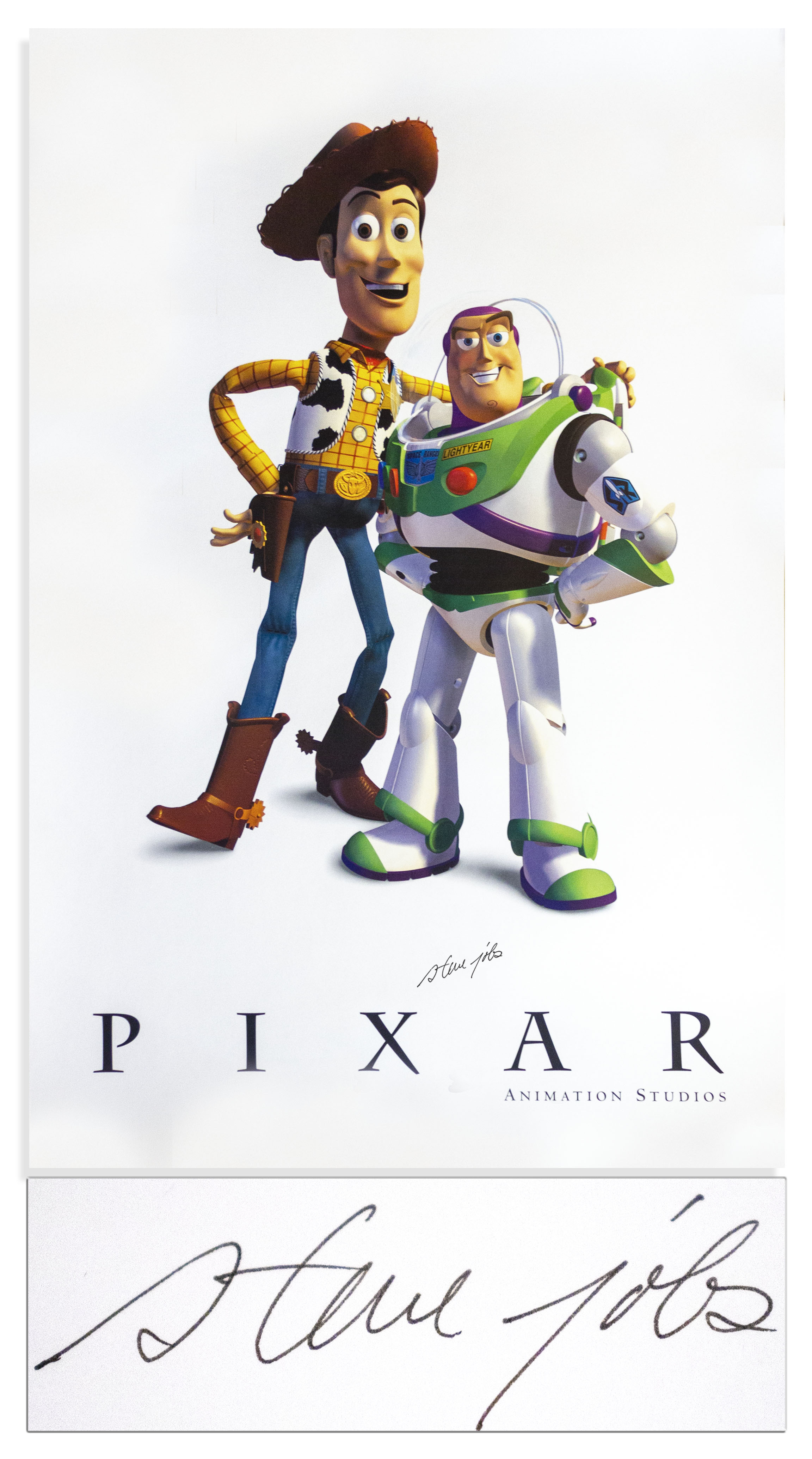 Recientemente la casa de subastas Nate D. dio a conocer que posee un artículo de colección tremendamente valioso. Se trata de un póster de Toy Story de 24x36 pulgadas de Woody y Buzz Lightyear, los personajes principales de la película animada con la firma de Steve Jobs, el cual subastarán este jueves 29 de agosto.