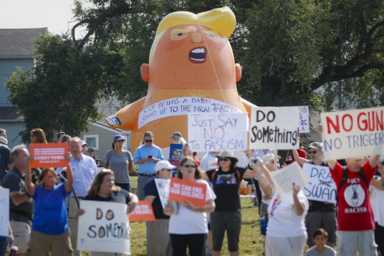 A las afueras del hospital lo esperaban decenas de manifestantes, quienes exhibían un globo que representaba a un “bebé Trump”, con carteles en los que se leían frases como “Has algo”, “Tú eres la causa”, “Salva a nuestro país” y se escuchaban gritos como “¿Qué queremos? ¡Acción!”.