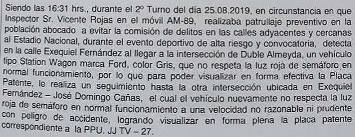 Fue ahí cuando el fiscalizador de Seguridad Ciudadana, Vicente Rojas, siguió al ex diputado UDI -sin saber, entonces, de quién se trataba- hasta Exequiel Fernández con José Domingo Cañas, donde volvió a cruzar con luz roja, "a una velocidad no razonable ni prudente, con riesgo de accidente", según aparece en el documento.