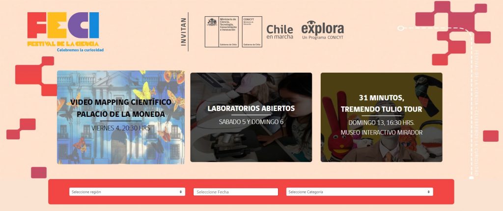 Todas las actividades, para Santiago y regiones, están disponibles en el buscador de www.festivaldelaciencia.cl. Ahí solo debes seleccionar tu región, la fecha por la que quieres consultar y el tipo de actividad. Hay teatro, cine, charlas, exposición, feria científica, laboratorios abiertos, talleres y más.