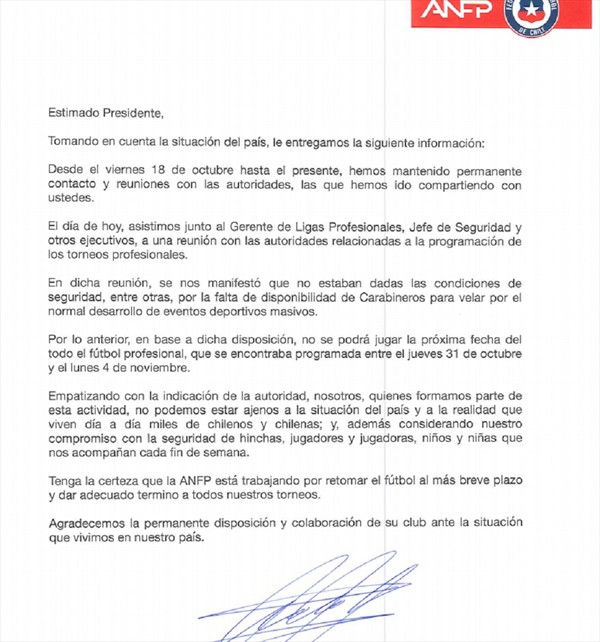 La Asociación Nacional de Fútbol Profesional (ANFP) decidió suspender nuevamente las actividades deportivas durante este fin de semana. Esto incluye la Primera División, Primera B, Segunda División Profesional, y el fútbol femenino e infantil. La suspensión es debido a la difícil situación por la que pasa el país.