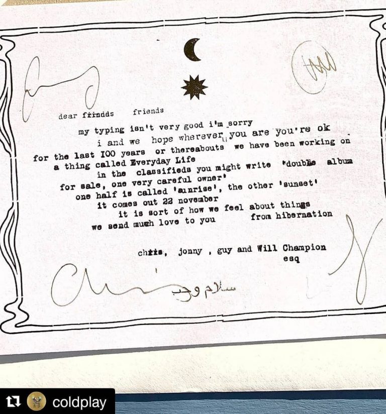 "Queridos amigos. Mi letra no es muy buena, lo siento. Esperamos que donde quiera que estén, estén bien. Durante los últimos 100 años aproximadamente hemos estado trabajando en una cosa llamada Everyday Life. En la clasificación deberían escribir «doble album a la venta, propietario muy cuidadoso». Una mitad se llama “Sunrise”, la otra “Sunset”. Saldrá a la luz el 22 de noviembre. Es una prueba de cómo nos sentimos sobre las cosas. Les mandamos mucho amor desde la hibernación. Chris, Jonny, Guy y Will Campion", fue parte de lo que escribieron en una carta que publicaron en sus redes sociales.