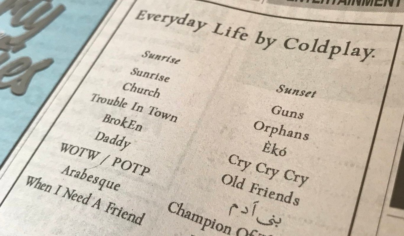 Además Coldplay dio a conocer de forma novedosa el listado de las canciones de estos discos, porque lo hicieron a través de publicaciones en diarios de distintos países.