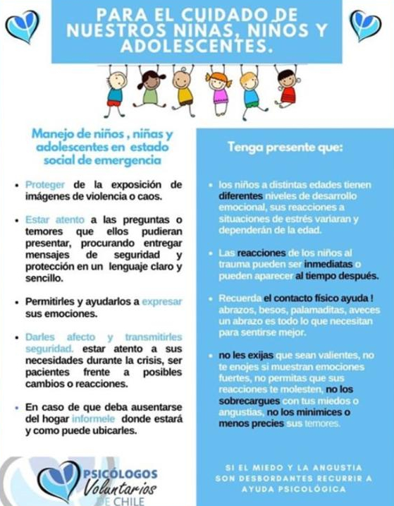 Uno de los más recientes carteles de Psicólogos Voluntarios de Chile, "Manejo de niños, niñas y adolescentes en estado social de emergencia" que ayuda a los adultos a enfrentar situaciones como las que vivimos por estos días desde el decreto del Estado de Emergencia.