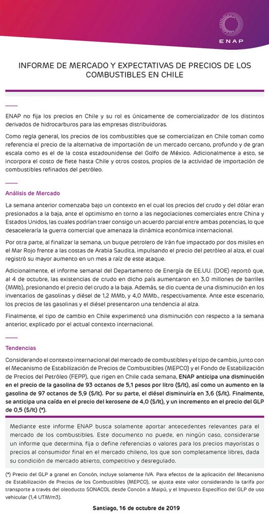 Por si aún no lo sabías, la Empresa Nacional de Petróleo anunció una baja en algunas bencinas para el día de hoy.