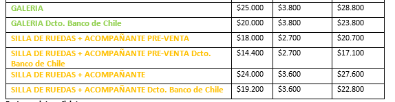 - 20% de descuento pagando con tarjetas del Chile 3, 9 ó 12 cuotas sin interés. Máximo 6 entradas por cliente.