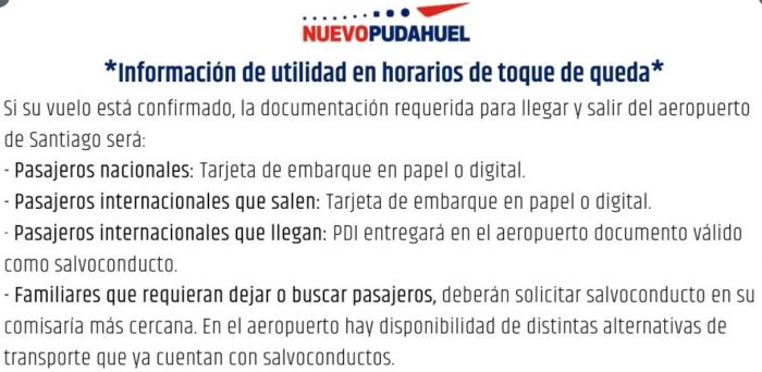 Además, mediante su Twitter entregaron una serie de medidas que te pueden ser muy útiles en caso de que haya toque de queda y tengas que salir o llegar al aeropuerto en ese horario