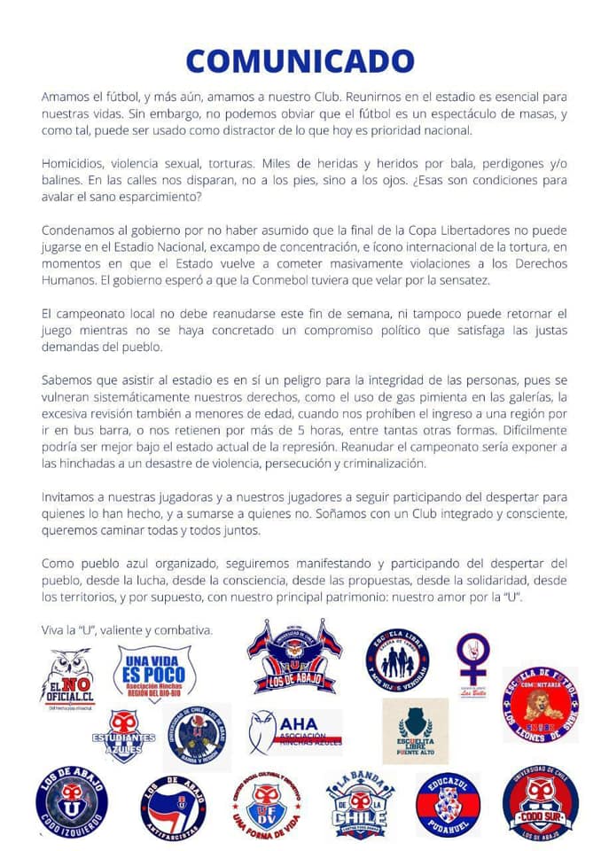 Los de Abajo, barra de Universidad de Chile, se manifestaron en redes sociales a través de un comunicado que en parte decía: “el campeonato nacional no debe reanudarse, ni tampoco puede retornar el juego mientras no se haya concretado un compromiso político que satisfaga las justas demandas del pueblo”.