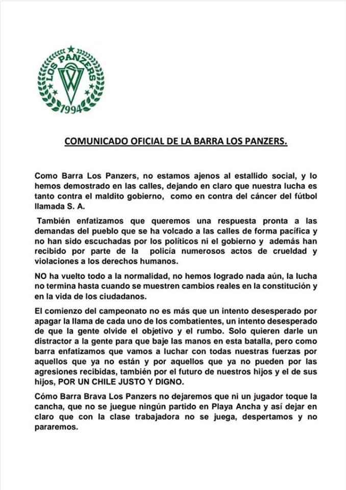 Algo parecido hicieron sus clásicos rivales, Los Panzers de Santiago Wanderers: "No dejaremos que ningún jugador toque la cancha, que ningún partido se juegue en el Elías Figueroa Brander y así dejar en claro que con la clase trabajadora no se juega", y agregaron la frase "Por un Chile justo y digno".