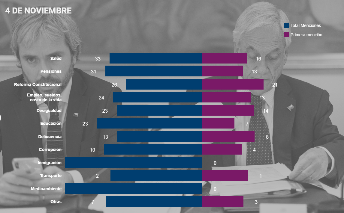 Al respecto, un 33% de los encuestados indicó que debería ser la salud, un 31% las pensiones y un 26% apuntó a una nueva reforma constitucional. En la misma línea, empleos, sueldos y calidad d vida marcaron un 24%, mientras que desigualdad y educación un 23%.