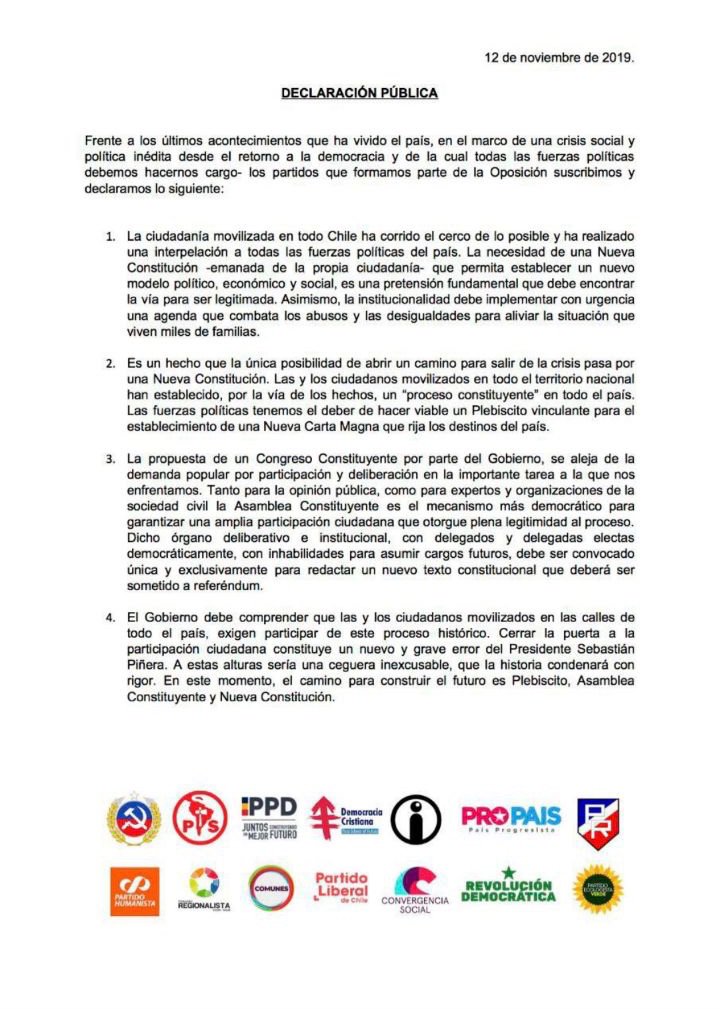 Esta tarde 14 partidos políticos firmaron un comunicado donde se unen como oposición al gobierno para exigir al gobierno el cumplimiento de las demandas sociales. Estas son: Plebiscito ciudadano, Asamblea Constituyente y Nueva Constitución.