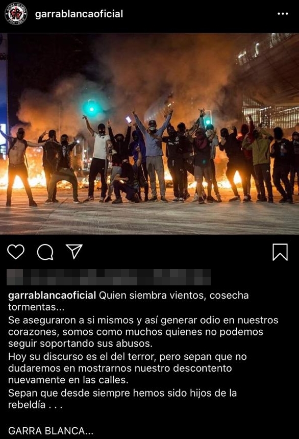 También hay imágenes publicadas en Instagram que muestran al joven perteneciente a una facción de la Garra Blanca dando a entender que participó en el hecho, entre ellas, una foto en que celebra la quema de la estación.