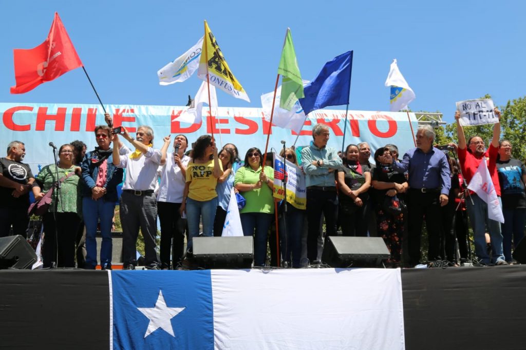 La manifestación alcanzó el Palacio de la Moneda a eso de las 13.00 hrs., mismo lugar donde se instaló un escenario donde representantes de los distintos gremios que conforman la Mesa de Unidad Social, como la presidenta de la CUT, Bárbara Figueroa, y la cabeza del colegio de profesores Mario Aguilar.