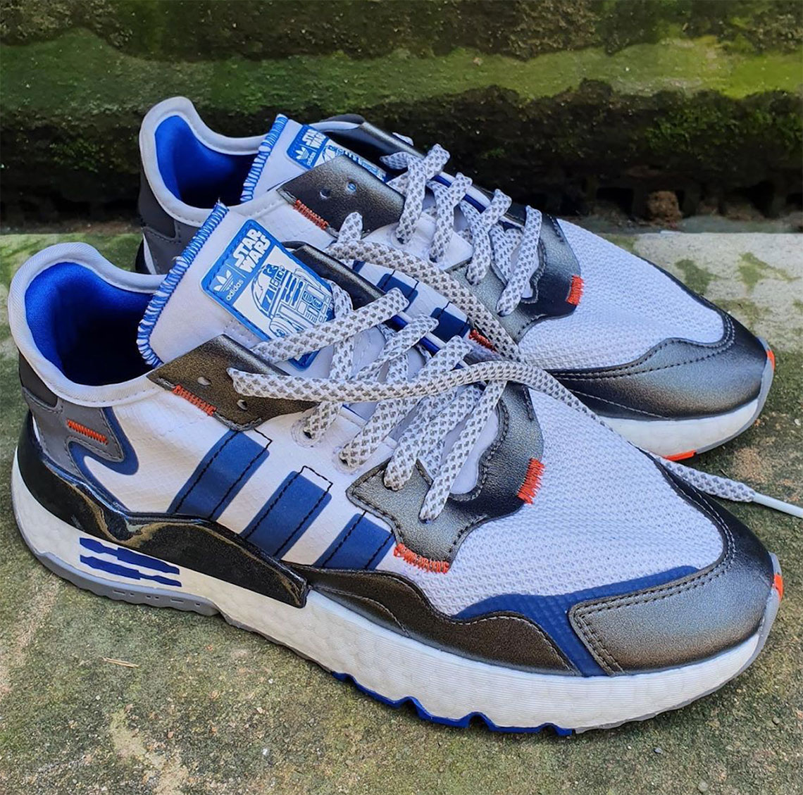 R2-D2 está representado dentro del estilo Nite Jogger del paquete, acompañado de una contraparte con temática Stormtrooper. Cada par viene acentuado con detalles reflectantes y logotipos del mismo nombre que incluyen un amuleto de encaje, un sello personalizado de Adidas con el personaje y las crestas asociadas que se encuentran en el talón superior del zapato. Impreso en el estilo Boost of the Stormtrooper, se lee "¡Open the blast doors!"