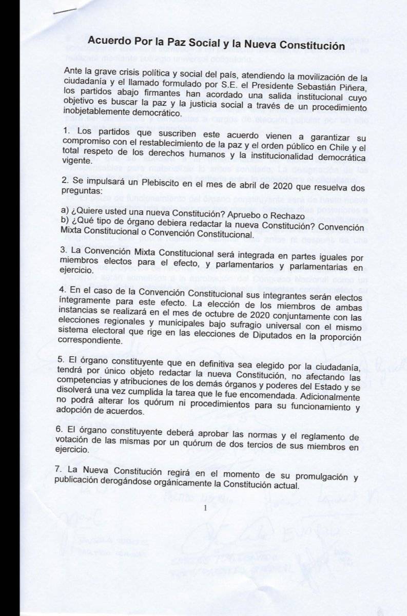 La madrugada de este viernes después de una intensa jornada de negociaciones en el ex Congreso Nacional oficialismo y oposición firmaron un acuerdo por la paz y una nueva Constitución.