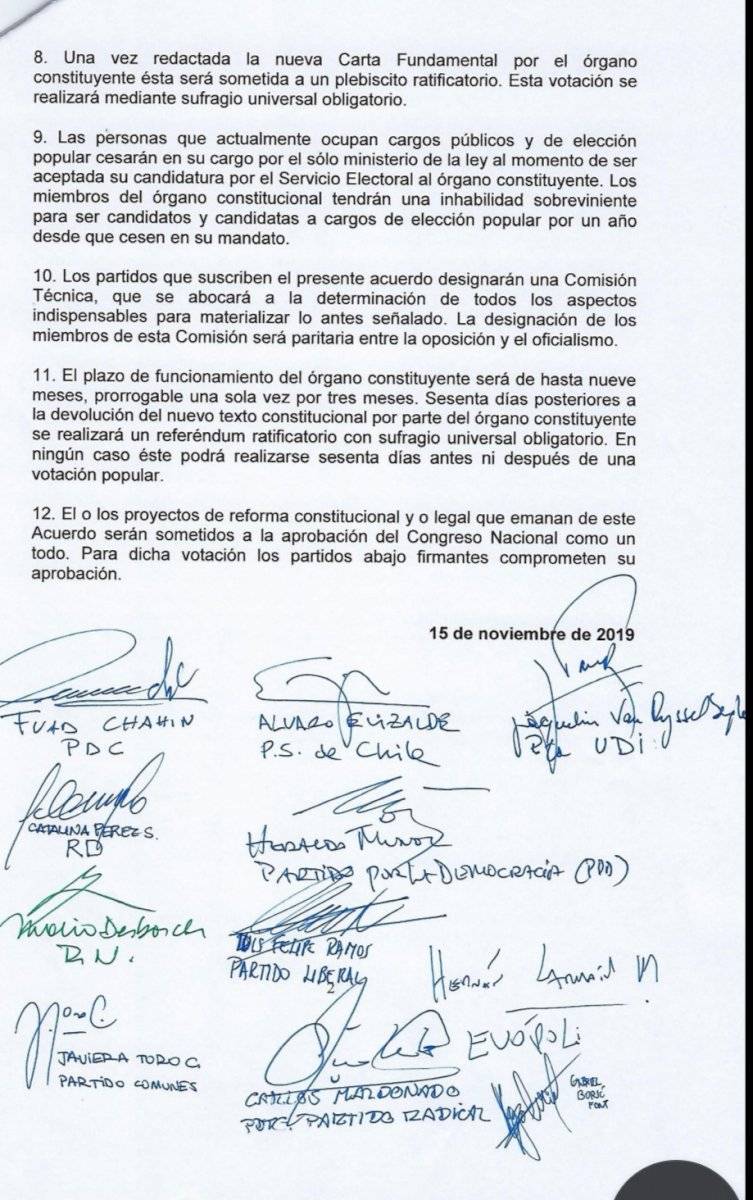 La madrugada de este viernes después de una intensa jornada de negociaciones en el ex Congreso Nacional oficialismo y oposición firmaron un acuerdo por la paz y una nueva Constitución.