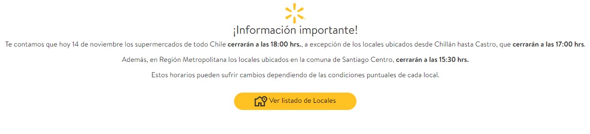 Supermercados Lider, Express Lider, Acuenta, y Bodega Mayorista cerrarán de manera anticipada a las 15:00 en Santiago Centro, mientras que en el resto de la Región Metropolitana el cierre será a las 20:00 horas. En regiones, el horario se extiende hasta las 21:00 hrs.