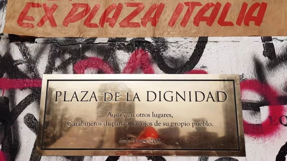 Este hito simbólico de nuestra ciudad ha sido el centro neurálgico de las manifestaciones por décadas, sin embargo su nombre y los monumentos que la acompañan no reflejan al pueblo de Chile, sus demandas ni su identidad. Es por eso que un grupo de ciudadanxs decidió desplegar un lienzo con el que rebautizaron a este espacio urbano como: Plaza de La Dignidad.”