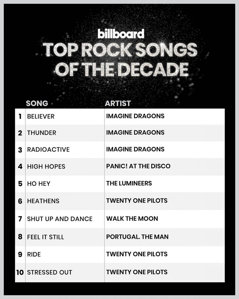 Otra banda destacada es Twenty One Pilots, que tiene tres canciones dentro del Top 10 de la década. Sin duda no conocemos cuáles son los parámetros de Billboard para seleccionar una canción de rock, pero sin duda esto dará que hablar. Revisa el listado completo aquí y a continuación te dejamos el listado con las 10 primeras: