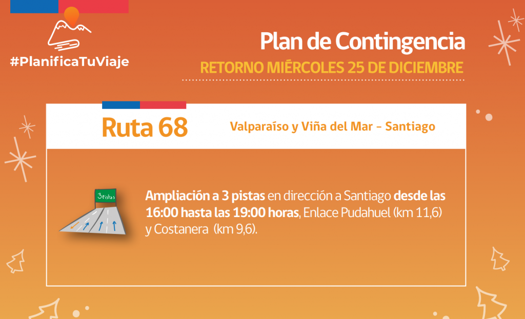 El segundo es para el regreso y consiste en ampliación de 3 pistas en dirección a Santiago, desde las 16 hasta las 19 hrs., en el Enlace Pudahuel y Costanera.