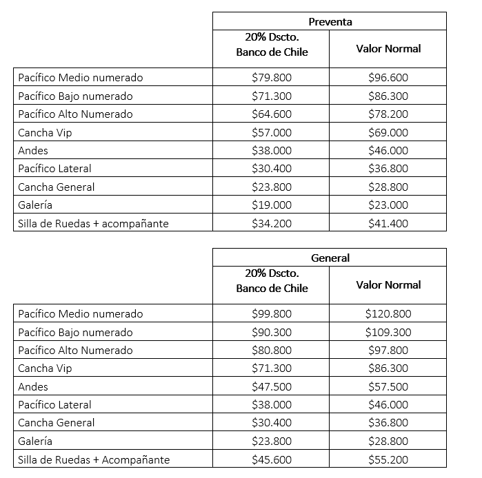 La venta se dará en dos partes. La primero es con la Preventa Exclusiva para Clientes Banco de Chile desde este viernes 20 de diciembre, al mediodía, hasta el 23 de diciembre 11:59 horas o hasta agotar stock de 30.000 tickets. Aquí la modalidad y beneficios son los siguientes: