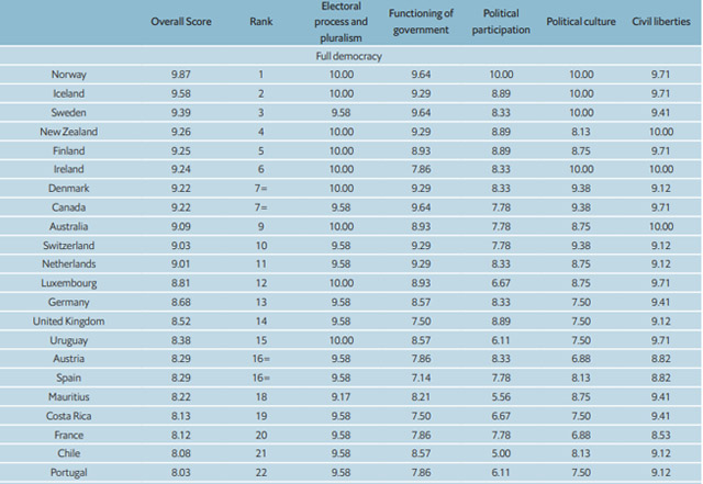 La publicación del medio The Economist considera además que 76 de 167 países son democráticos (45,5 por ciento), de los cuales 22 tienen sistemas "plenos" y 54, "defectuosos".