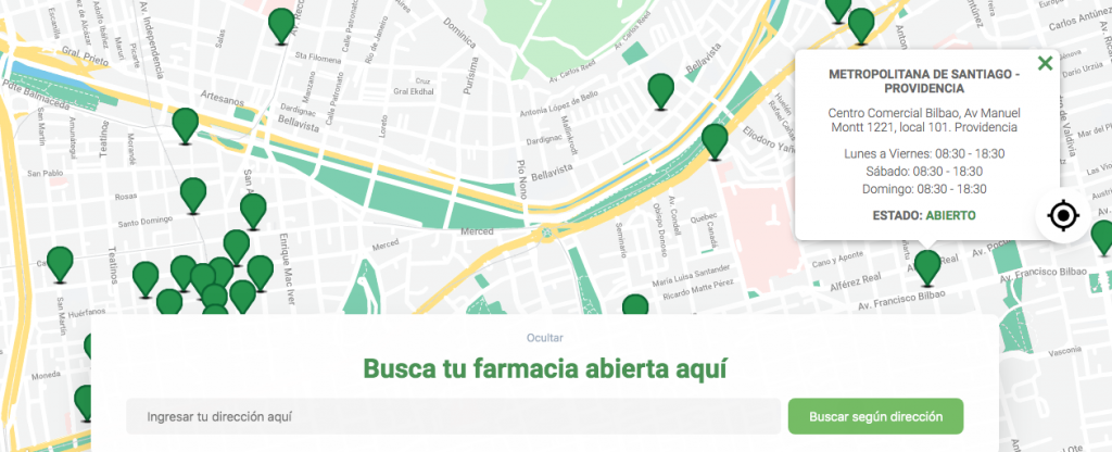 La cadena habilitó un portal con un mapa interactivo para que puedas buscar el local Cruz Verde más cercano a tu ubicación. Tienes que pinchar en el ícono verde y revisar cuáles son sus horarios de apertura y cierre. Esta información te sirve tanto para compra online, como para compra presencial.