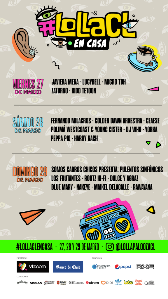 La música revive en épocas de cuarentena y por eso, este fin de semana no te puedes perder los conciertos #LollaCLEnCasa que el festival Lollapalooza Chile organizó para disfrutes en tu hogar. Lucybell, Fernando Milagros y Javiera Mena son algunos de los nombres que serán parte de tres días de shows en vivo, que coinciden con la fecha en que originalmente se iba a desarrollar el festival.