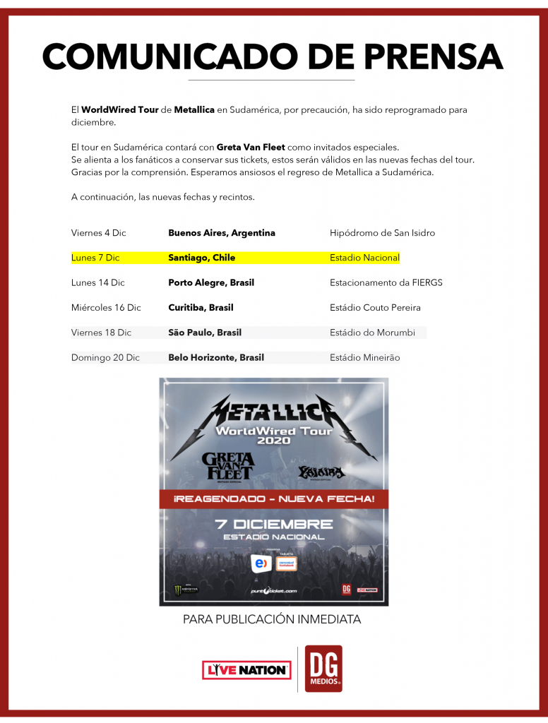La información llegó de la misma banda que también aseguró que realizará conciertos por streaming, cada lunes a partir de ahora. Pero eso no fue todo, porque en la misma semana Metallica ya confirmó la reprogramación de toda su gira sudamericana, la que precisamente partía con el concierto de Santiago el próximo mes.