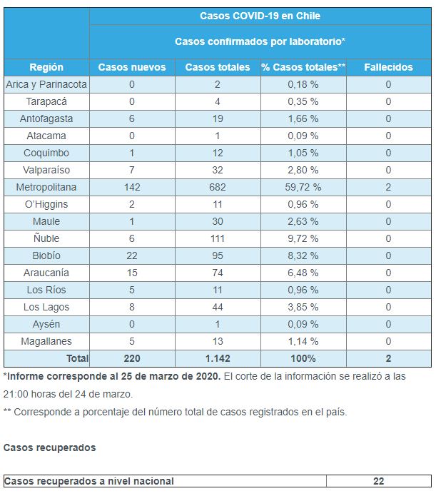 En ese último informe, se confirmaron 220 nuevos casos respecto a las cifras entregadas el día de ayer, por lo que actualmente el total país de positivos es de 1.142 personas.