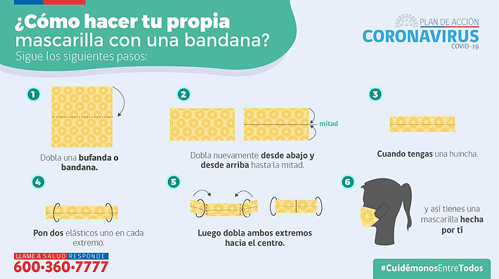 Aquí te dejamos el instructivo entregado por el Ministerio de Salud Chileno, que también explica cómo realizar una mascarilla con una bandana:
