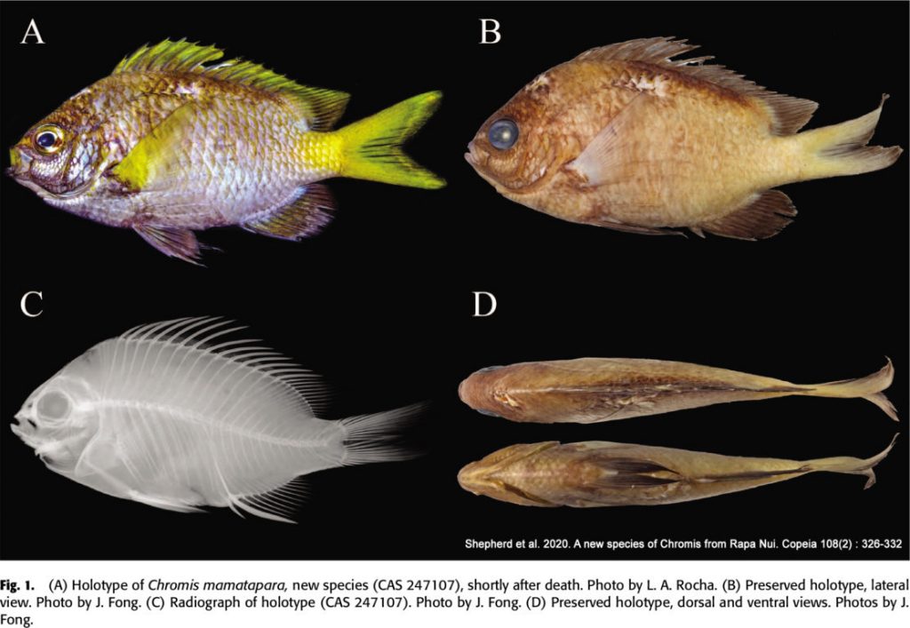 “Rapa Nui posee un alto grado de endemismo de sus peces costeros (21.7%), por lo tanto es probable que Chromis mamatapara sea endémico de esta región. Los peces recolectados se registraron a una profundidad de 90 metros en un arrecife rocoso rodeado de una gran área arenosa”, se explica en un artículo científico publicado en Copeia, revista científica de la Sociedad Americana de Ictiólogos y Herpetólogos (ASIH).