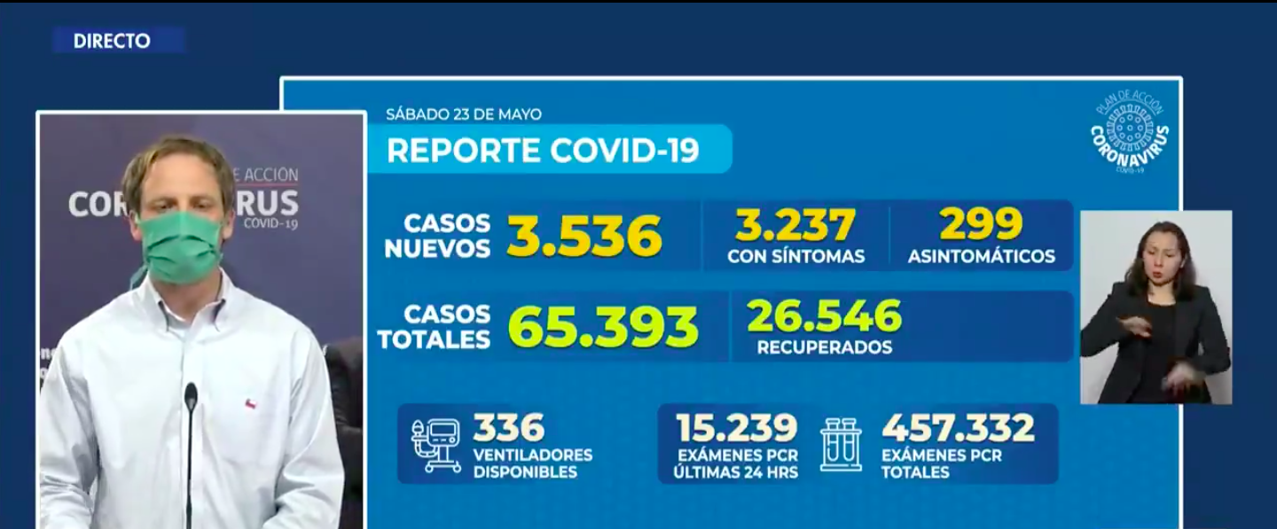 Hace unos instantes, el ministerio de Salud entregó la actualización diaria respecto a la situación de la pandemia por covid-19 en nuestro país. El día de ayer se presentaron 3.536 casos nuevos confirmados, sumando un total de 65.393 infectados en nuestro país desde el inicio de la pandemia.