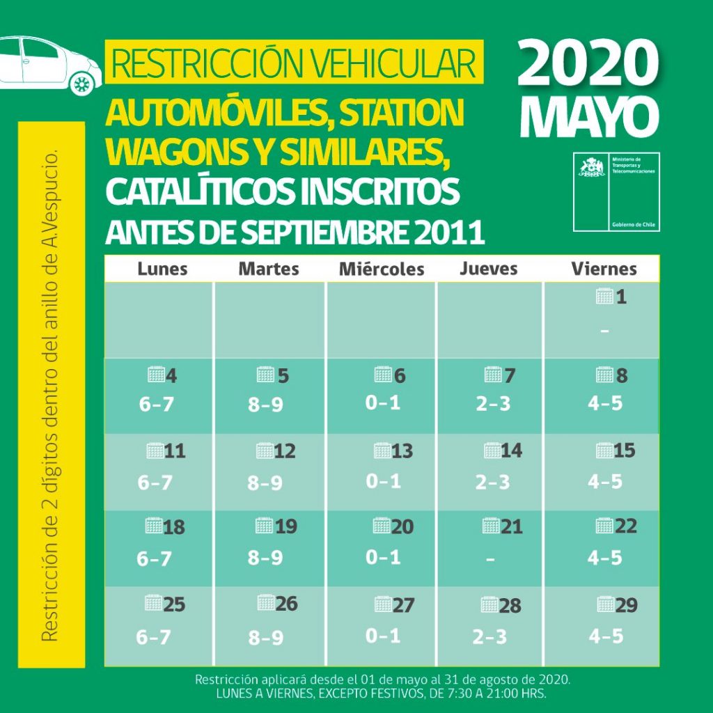 Desde el 1 de mayo y hasta el 31 de agosto se aplicará la restricción vehicular 2020, la que por tercer año consecutivo aplica restricción permanente a los vehículos con sello verde (catalíticos), es decir un día fijo de restricción a la semana, para aquellos vehículos con fecha de inscripción previa a septiembre de 2011.