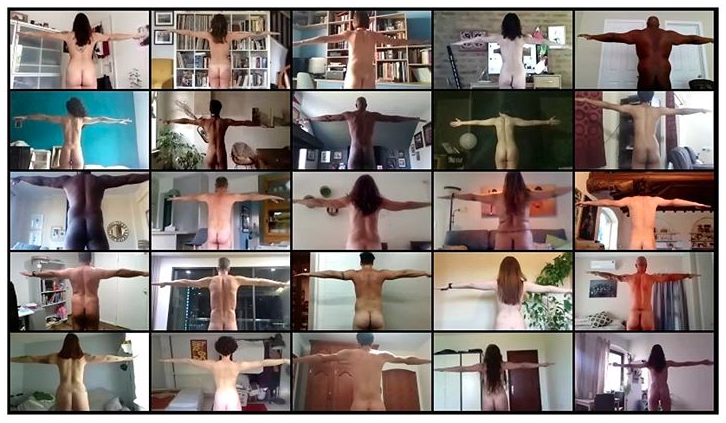 Los fotografiados están desnudos, pero también aparecen con mascarillas. Otro de las poses implica posar en un sillón, sobre la cama o creando un mosaico con fotografías conectándose a través de la posición de las manos.