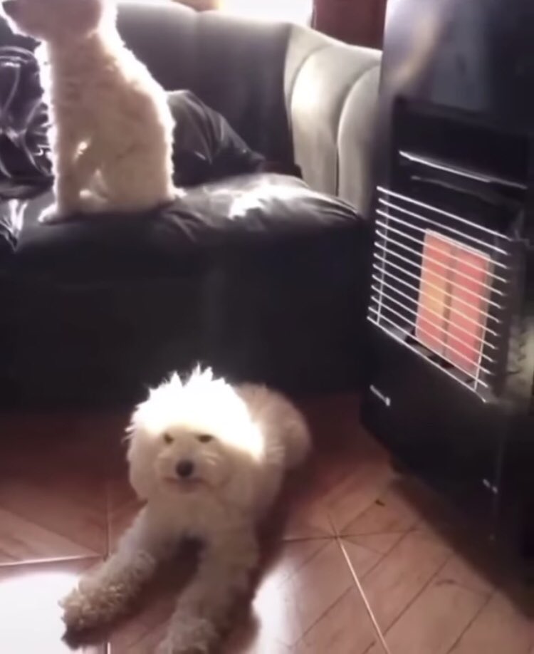 Efectivamente, al enfocar a la perrita Blanca, un poco de humo sale desde su peludo lomo. Justo atrás de Blanca, hay otro perrito de la misma raza que está corriendo el mismo efecto porque se encuentra sobre un sofá un poco más alejado de la estufa.