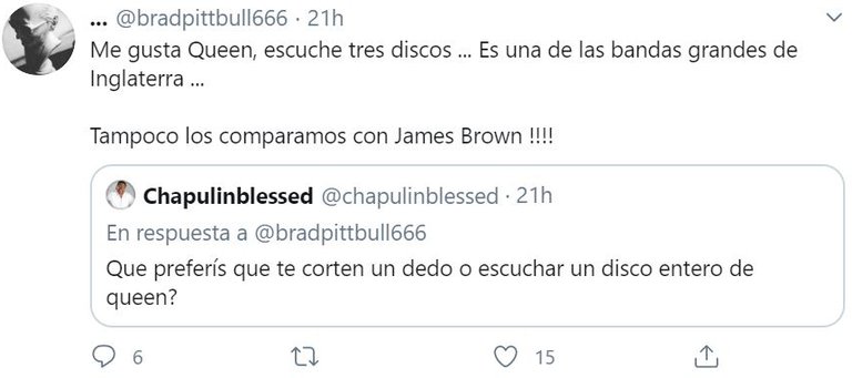 "Ahora mismo pongo un disco de Queen y lo canto entero a los gritos ... A los quince años hubiera matado por verlos en vivo, los vi a los veinte ... luego podría matar por mucho menos", siguió explicando en su cuenta personal @bradpittbull666.