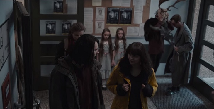 Mientras los tres caminan por el pasillo, en lo que parece ser una especie de celebración de Halloween en la escuela, se puede apreciar de fondo a dos gemelas idénticas a las de la película «El Resplandor». Al igual que en la cinta de Kubrick, las gemelas que aparecen en “Dark” visten vestidos celestes, tienen el cabello peinado hacia un lado y están tomadas de la mano.