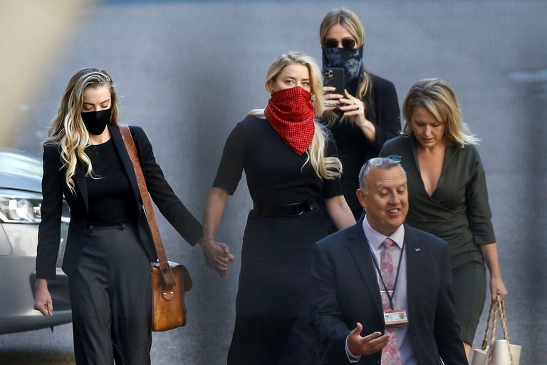 Amber Heard también llegó al juicio con un pañuelo rojo envolviendo su rostro