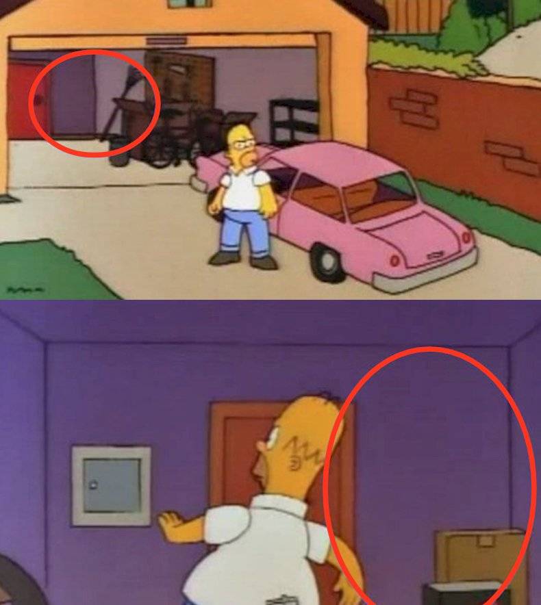 En la clásica intro presente desde la temporada 2 de los Simpson es posible ver un “error de continuidad”. Cuando Homero está en su patio es posible divisar un rastrillo en la cochera, el cual después desaparece y es reemplazado por unas cajas.
