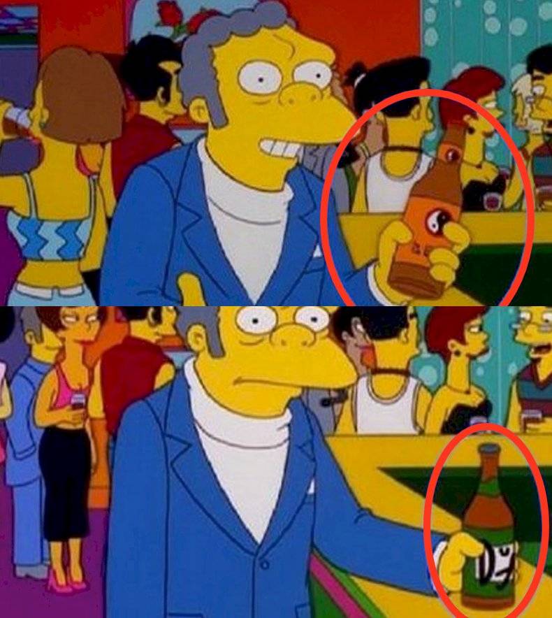 Otro de los errores donde está involucrado Moe tiene que ver con una cerveza. En una escena, Moe se encuentra en un bar tomando cerveza, pero entre una toma y otra, la etiqueta de esta cambia mágicamente.
