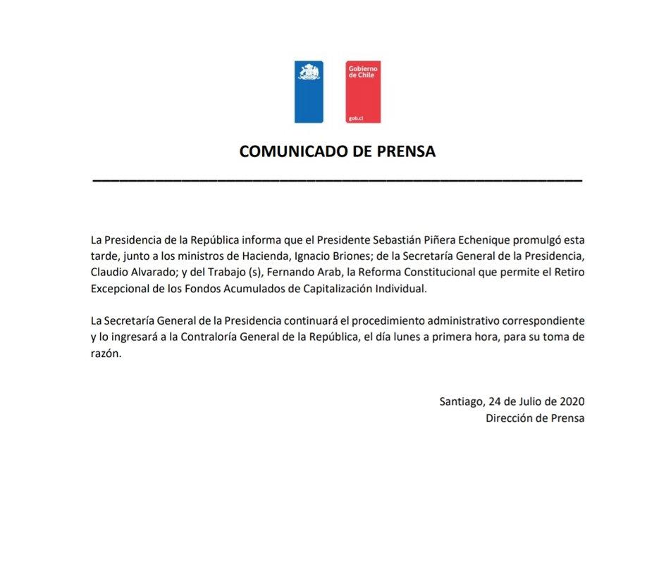 Durante la tarde noche del viernes, se envío un comunicado en donde se confirmó la promulgación del Retiro Excepcional de fondos de pensiones. El trámite continuará este lunes 27 de julio por la Contraloría General de la República.