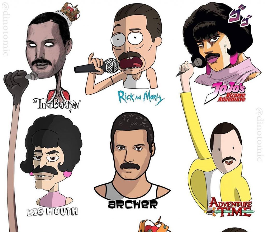 De esta forma es posible ver al cantante Freddie Mercury siendo un personaje de Los Simpson, Rick and Morty, Adventure Time, hasta como se veria si fuera parte de las cintas del director Tim Burton.
