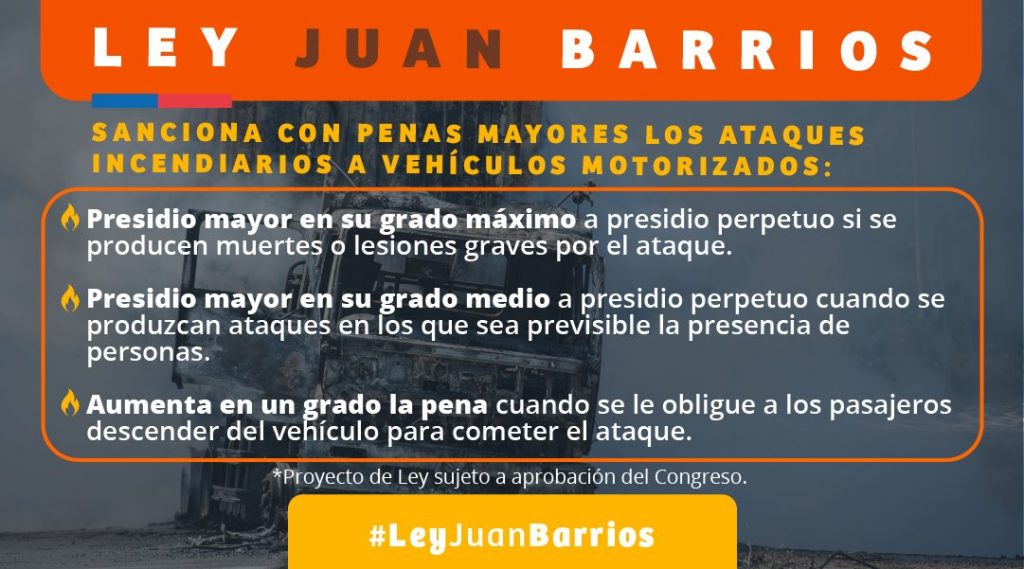 Durante la mañana de este jueves, el Presidente Sebastián Piñera firmó el proyecto de ley "Juan Barrios". Esto con el fin de endurecer las penas para quienes cometan ataques incendiarios contra camiones u otros vehículos motorizados y que, además, involucre la muerte.