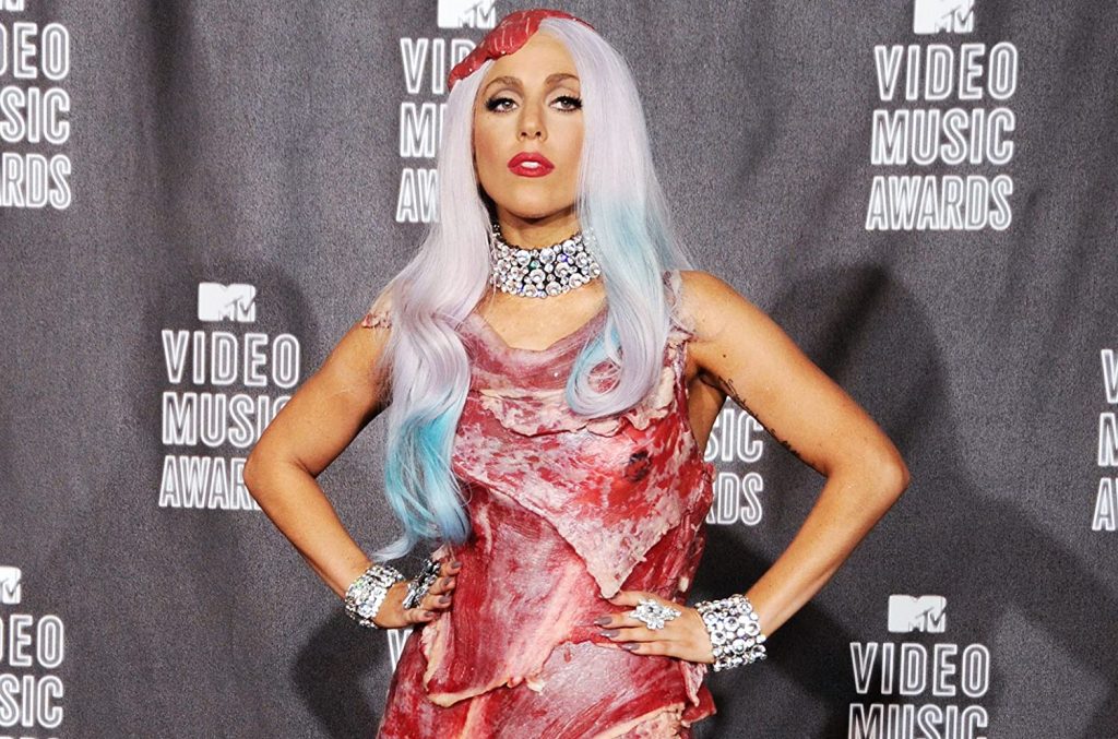 Vestida en más de 18 kilos de carne argentina de corte fino, Lady Gaga logró una figura aún más impresionante que sus 13 nominaciones dominantes en los VMAs 2010. "Si no defendemos lo que creemos y si no luchamos por nuestros derechos, muy pronto tendremos tantos derechos como la carne de nuestros propios huesos", dijo más tarde a Ellen DeGeneres sobre el simbolismo del vestido. "Y yo no soy un pedazo de carne". Completo con tacones envueltos en carne de res, sombrero y cartera, el atuendo fue armado por el diseñador de Los Ángeles Franc Fernandez con cortes del carnicero de su familia y, según los informes, tenía un olor dulce. Justo antes de aceptar el premio al Video del Año por "Bad Romance", bromeó: "Nunca pensé que le pediría a Cher que sostuviera mi cartera de carne".