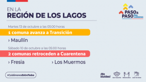 En la Región de Los Lagos, dos comunas retroceden al paso 1 de Cuarentena, Fresia y Los Muermos, que vuelven desde este sábado a las 5:00 horas. En la misma región, la comuna de Maullín avanza al paso de Transición.