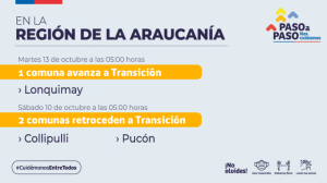 Por su parte, en la Región de La Araucanía, la comuna de Lonquimay avanza a Transición. Sin embargo, dos comunas, Collipulli y Pucón, retroceden al paso 2 desde el 10 de octubre a las 5:00 horas.