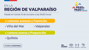 De este modo, la Subsecretaria de Prevención del Delito, Katherine Martorell, señaló que las comunas de Valparaíso y Viña del Mar avanzarán al paso 2 de Transición. Además, en la Región de Valparaíso, Quillota avanza al paso 3 de Preparación. Esto a partir del martes 13 de octubre desde las 5:00 horas.