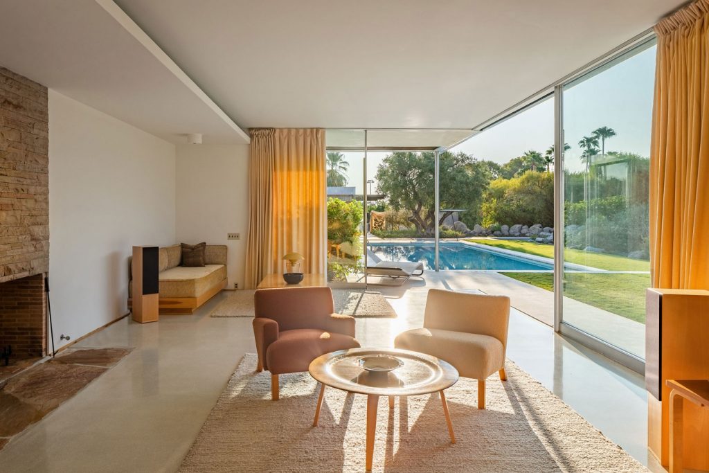 La casa cuenta con paredes de vidrio que se abren a una serie de terrazas o vistas a la piscina, el jardín y el desierto. También tiene una sala de estar en el techo con vista a las montañas, cinco dormitorios y seis baños completos en 297 metros cuadrados.
