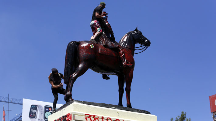 Este 18 de octubre, cientos de personas comenzaron a congregarse en Plaza Baquedano y otros puntos de Santiago, en el marco de las manifestaciones por el aniversario del estallido social. El día viernes pasado, manifestantes habían pintado de rojo el monumento pero en la madrugada del día sábado, lo volvieron a restaurar. Sin embargo hoy se puede apreciar que un grupo de personas le están realizando otros rayados y además le han vuelto a poner pintura de color rojo.